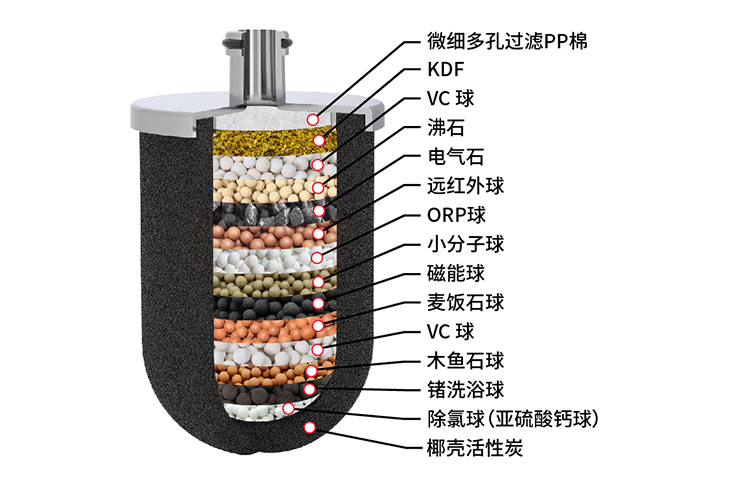 濾芯內(nèi)含活性炭,KDF,VC等材料,有效去除水中有害物質(zhì),抑菌并且增加美白功效。